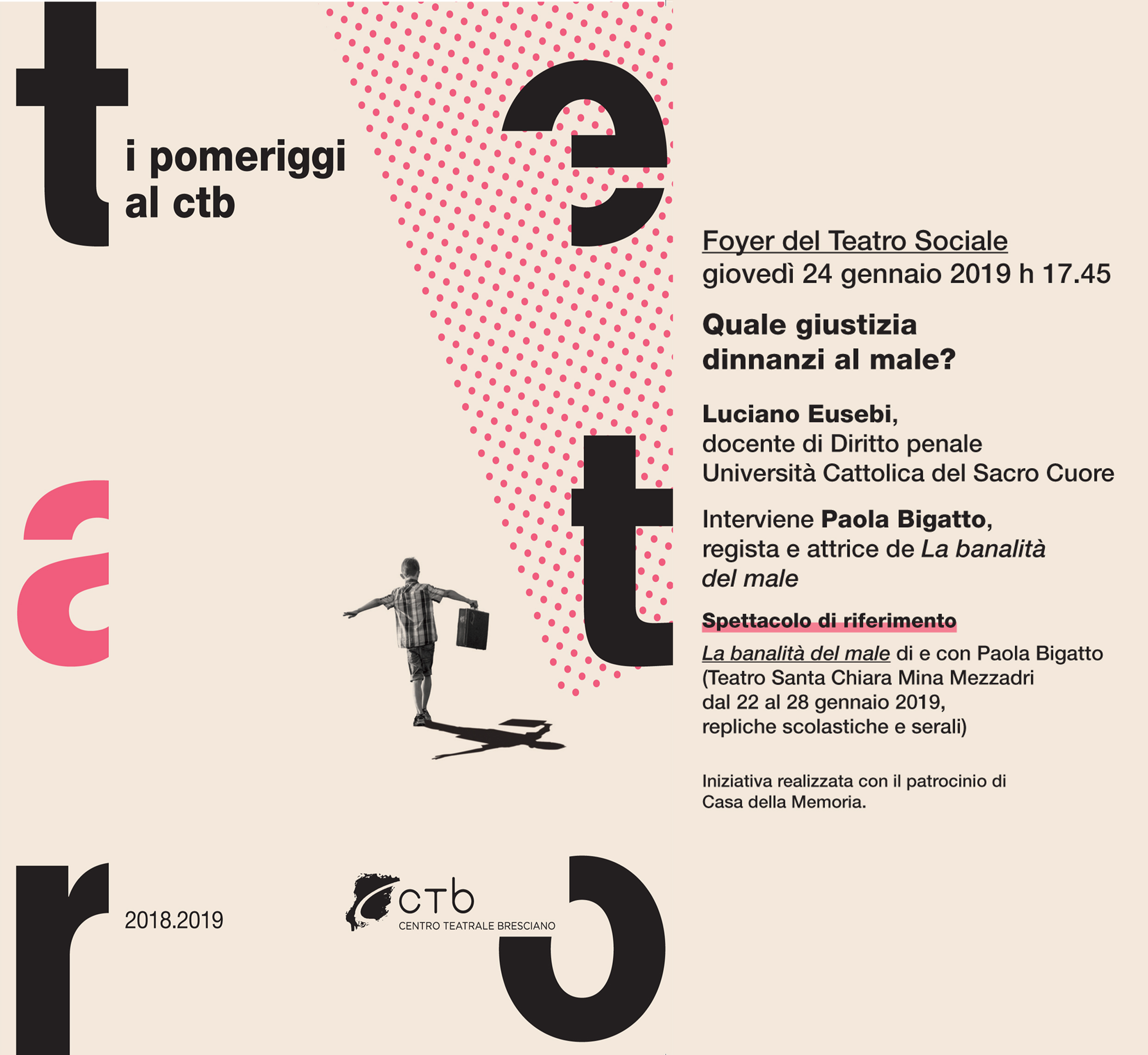 La riflessione sull’opera di Hannah Arendt è al centro dell’incontro del ciclo I pomeriggi al CTB di giovedì 24 gennaio. Alle ore 17.45 nel foyer del Teatro Sociale di Brescia, Luciano Eusebi, docente di Diritto penale presso l’Università Cattolica del Sacro Cuore e tra i più eminenti studiosi a livello nazionale e internazionale di teoria della pena e del reato e riforma del sistema sanzionatorio penale, rifletterà su quale giustizia sia possibile di fronte al Male. Seguirà un dibattito con l’attrice e regista Paola Bigatto, autrice e protagonista dello spettacolo dedicato alla grande filosofa tedesca e alla sua riflessione storico-politica intorno al processo Eichmann. L’iniziativa vede il patrocinio di Casa della Memoria. L’ingresso a questo appuntamento è libero sino a esaurimento posti disponibili.