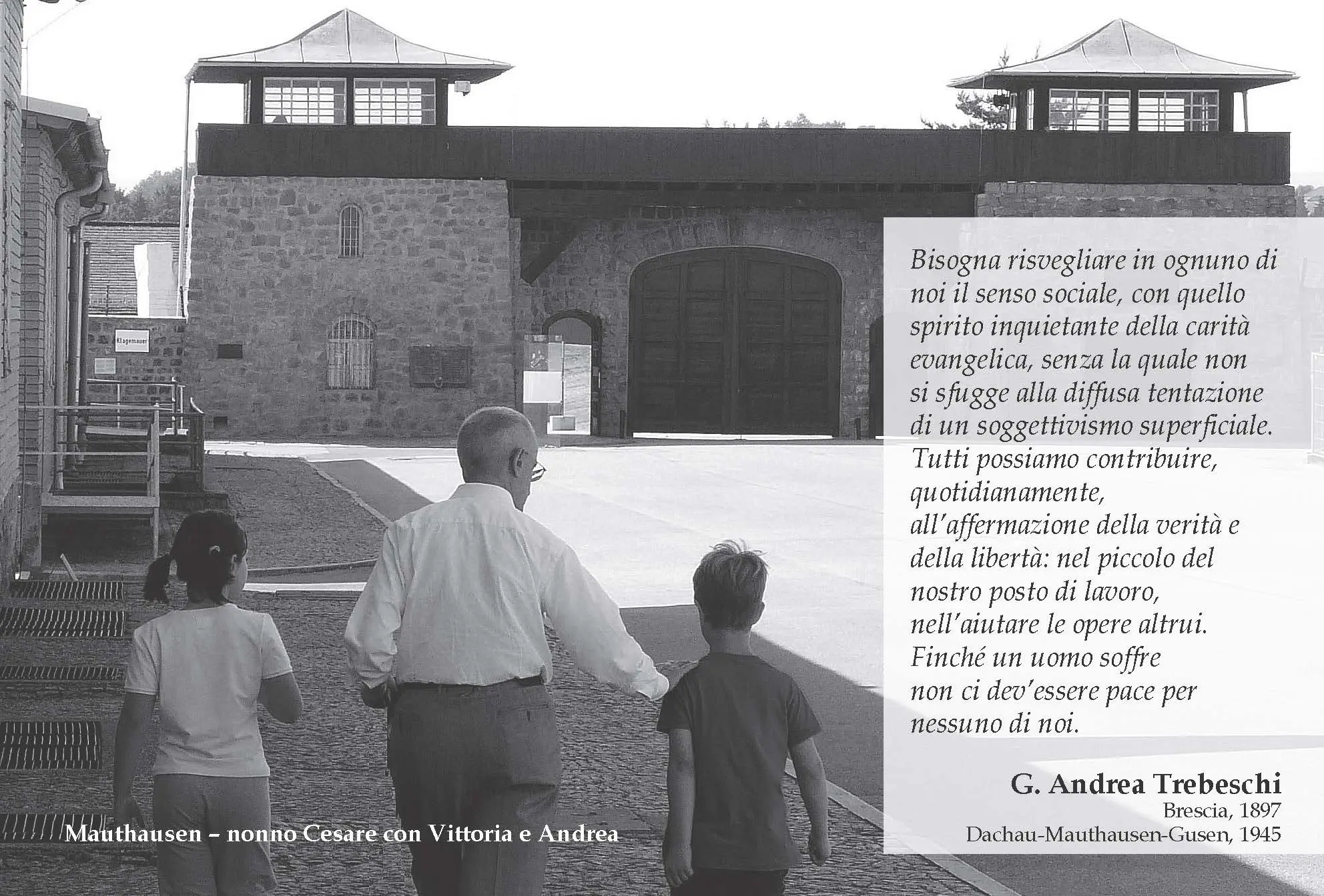 "Le idee valgono per quello che costano, non per quello che rendono." La frase di padre Giulio Bevilacqua accompagna, sabato 24 gennaio alle 19 nella chiesa della Pace, la celebrazione della Messa in ricordo di Gian Andrea Trebeschi (1897-1945). Insieme a milioni di deportati, a Gusen Trebeschi ha pagato anche per noi l’ultimo prezzo del suo programma e del suo destino: ama il tuo Dio e ama il tuo prossimo, un prossimo fatto di ebrei, cristiani - cattolici, ortodossi, protestanti - politici, migranti, testimoni di Geova, omosessuali, malati psichici, disabili, asociali, rom e sinti, disoccupati, ma anche delinquenti comuni, aguzzini e carnefici.