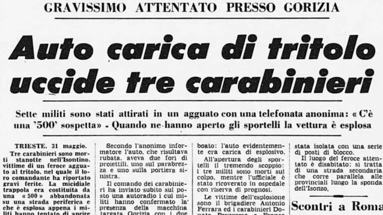 The facts date back exactly half a century ago. On the evening of May 31, 1972, an anonymous phone call to the Gorizia Carabinieri reported the presence of a white Fiat 500 abandoned in a small street just outside Peteano di Sagrado, with holes in the windshield that looked like bullet holes. The checks are triggered, the car is searched, second lieutenant Angelo Tagliari decides to open the bonnet and activates the lever. But a detonator (technically a tear-off igniter) is attached to that lever and the car, packed with explosives in the front trunk, blows up, killing the three carabinieri who were right in front of the hood. The victims all come from the South: Brigadier Antonio Ferraro, Sicilian, 31 years old, and the Carabinieri Donato Poveromo, Lucanian, 33 years old, and Franco Dongiovanni from Lecce, just 23 years old. They were all married and Ferraro’s wife was pregnant. The open door instead acts as a shield for Tagliari, who was nevertheless seriously injured: thrown many meters away, he lost a hand and also suffered burns and wounds.