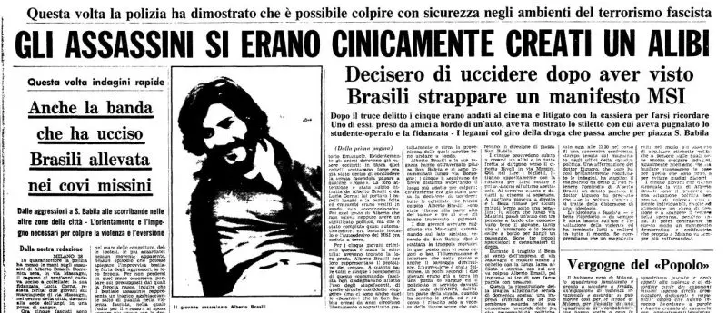 In 1975 the clashes between elements of the extreme right and the extreme left in Milan created a widespread climate of mutual distrust and violence, intriveled by the killings of Sergio Ramelli (assaulted on March 13 and died on April 29), Claudio Varalli (killed on April 16) and Giannino Zibecch] (killed on April 17). On the evening of Sunday, May 25, 1975, Brasili is walking downtown with his girlfriend, Lucia Corna, a few years younger than him; he wears an eskimo, jeans, wears a beard and long hair and for those years this is enough to identify him as a left-wing militant and in addition the eskimo is almost a uniform for the protagonists of the youth protest.
