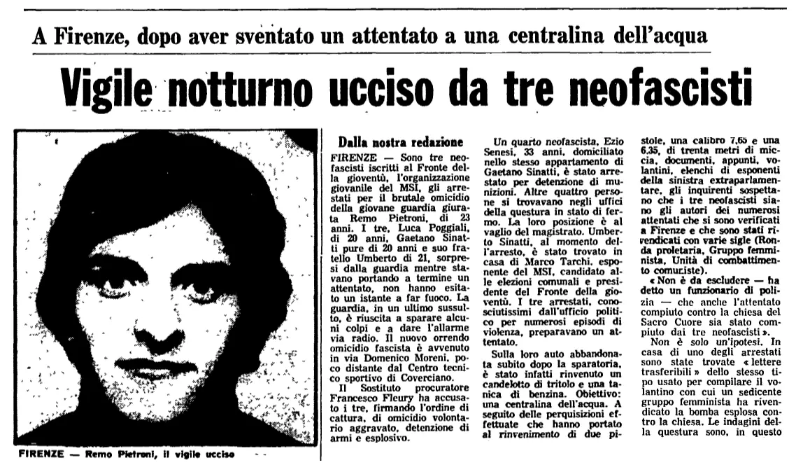 Era il 30 giugno del 1977 quando il metronotte Remo Petroni nel suo giro quotidiano in via Moreni, notando una Simca ferma con tre giovani, (componenti del Fronte della Gioventù) che armeggiavano in maniera sospetta dentro l’auto, si avvicinò per un controllo.