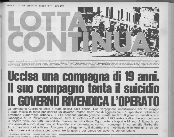 Roma, 12 maggio 1977. Una ragazza cade colpita da un proiettile al centro di un incrocio, mentre scappa verso Trastevere. Dall’altra parte, sul ponte Garibaldi, sono attestate le forze dell’ordine. Lei si accascia. La soccorrono. Non c’è sangue né bossoli. Fermano un’auto. La portano in ospedale. Il medico del pronto soccorso constata la morte. Giorgiana Masi fu uccisa da un proiettile blindato sparato da notevole distanza che la trapassò da parte a parte alle 8 di sera. Alla fine di una giornata di violenze scaturite da una manifestazione pacifica del Partito radicale. Era il 12 maggio. Pannella e i suoi volevano celebrare il terzo anniversario della vittoria al referendum sul divorzio e raccogliere firme per altri referendum. Cossiga, ministro degli interni, aveva vietato ogni manifestazione a Roma, dopo l’uccisione dell’allievo sottufficiale di Ps Settimio Passamonti, avvenuta durante gli scontri del 21 aprile, iniziati all’università (affianco alla chiazza del suo sangue comparirà, sull’asfalto, la scritta: “Qui c’era un caramba, il compagno Lorusso è vendicato”). Il centro di Roma era blindato da 1.800 uomini. Pannella non aveva accettato il divieto, che di fatto sospendeva la Costituzione nella capitale per un mese. “È un dovere disobbedire a ordini ingiusti”, aveva detto nel corso di una drammatica seduta parlamentare, mentre per strada divampavano gli scontri.