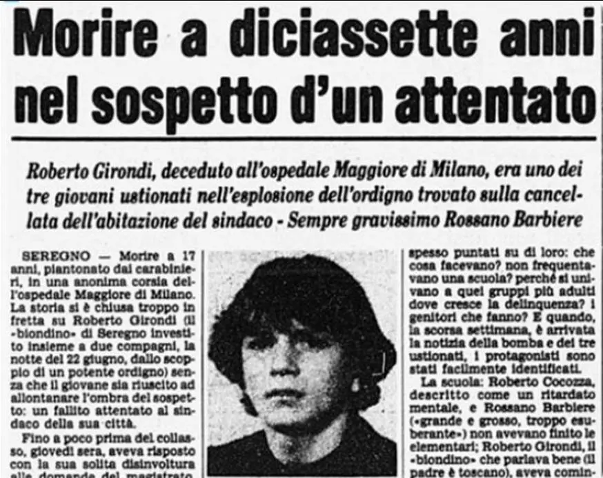 The other two are Roberto Cocozza, 17 and Roberto Girondi, 17. They only managed for a moment to say that they had seen a wrapper on the street. Intrigused they had approached. Then the explosion. It is quick to say “we found him on the ground while we were walking.” For the investigators it was immediately clear. “The three boys were preparing an attack. Something had gone wrong and they had blown up.” Public opinion was even tougher with the ‘bombers’ ‘I deserved it’ people thought.