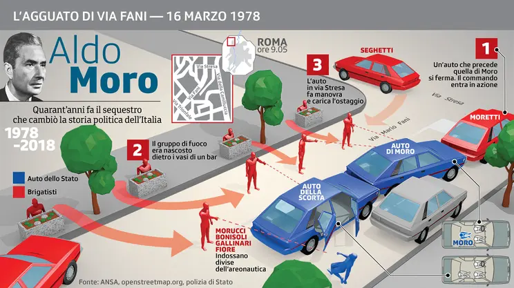 At about 9:00 am in via Mario Fani, Trionfale district, the car with Aldo Moro on board and that of the escort were blocked at the intersection with Via Stresa by a group of terrorists who immediately opened fire, killed the five men of the escort in a few seconds and kidnapped Moro. The terrorists immediately restarted in several cars and lost their tracks. In via Fani there remained the Fiat 130, with the ‘Roma L59812’ on which Moro was traveling, with the corpses of the driver, pinned by the carabinieri Domenico Ricci (43 years old) and the head of security, marshal of the carabinieri Oreste Leonardi (51 years old), and the Alfa Romeo Alfetta with the ‘Roma S9339393’ of the escort agents with the corpse of the guard on board. Giulio Rivera (23 years old) and the deputy brigadier of Public Security Francesco Zizzi (29 years old) seriously injured but still alive; supino riverso on the road level, near the car, also remained the body of the P.S. guard. Raffaele Iozzino, 24 years old. In front of the Fiat 130 remained a family Fiat 128 car with a license plate of the diplomatic corps ‘CD 19707’, stopped at the intersection and abandoned by its occupants.