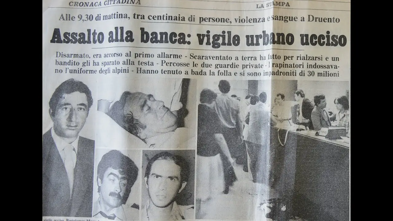 It’s July 13, 1979, right in the midst of the “Years of Lead” in Italy. Bartolomeo Mana, 34 years old, is on duty with a colleague in front of the Savings Bank on Via Torino in Druento, a village of almost eight thousand inhabitants on the outskirts of Turin. A quiet morning that quickly turns into terror. Four terrorists assault the bank, wielding weapons, they force the two armed guards and the two policemen, who were unarmed and outside, to enter. Everyone present is ordered to lie on the ground; Bartolomeo is pushed, loses his balance, and hitting his head as he falls. Stunned by the fall, he tries to get up but is shot at point-blank range in the back of the head. The robbers ransack what they can and flee in the yellow Giulietta they arrived in. Police and Carabinieri arrive, Bartolomeo Mana is rushed to the Maria Vittoria Hospital in Turin by ambulance, but he dies shortly after arriving at the Emergency Room. A senseless and unjustified death.