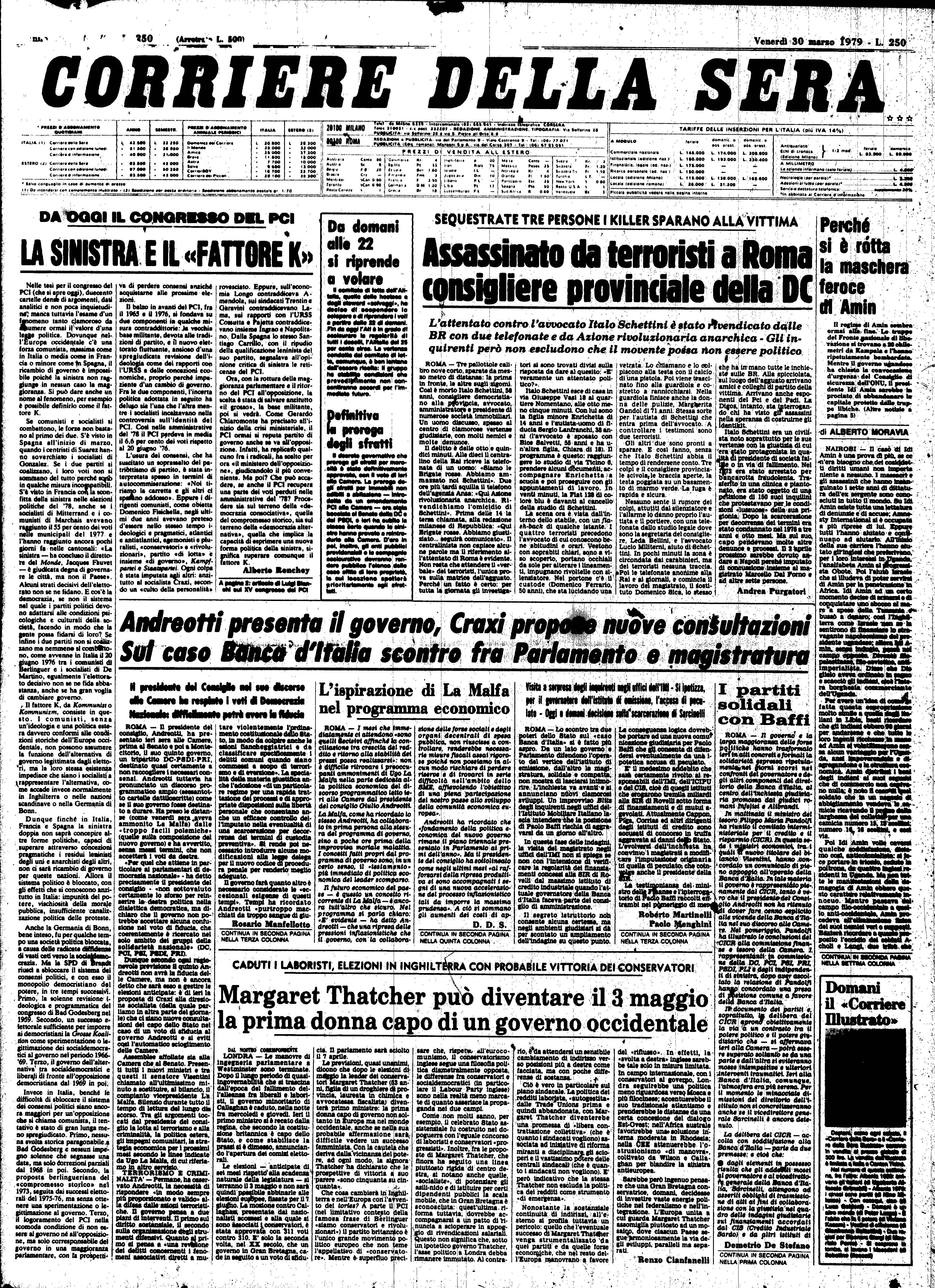 The lawyer Italo Schettini, 57 years old, a provincial counselor for the Christian Democracy party, was killed with gunshots at the entrance door of his office. His 14-year-old daughter Chiara saw the assassins fleeing. The murder was claimed by the “Red Brigades” and was part of their actions against the Christian Democracy party. The trial will establish that the organizers and perpetrators of the act were prominent members of the terrorist group that claimed responsibility.