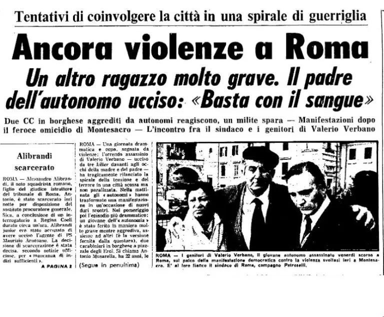 The murder had a huge impact on the city, also thanks to Verbano’s political activism. On February 25, the day of the funeral (and his birthday), there were several episodes of violence by groups linked to Autonomy, harshly repressed with charges and tear gas by the police, even inside the Verano cemetery, where Verbano was buried. From the windows of the San Lorenzo police station, an adjacent Roman neighborhood to the cemetery, several gunshots were even fired at the funeral procession.