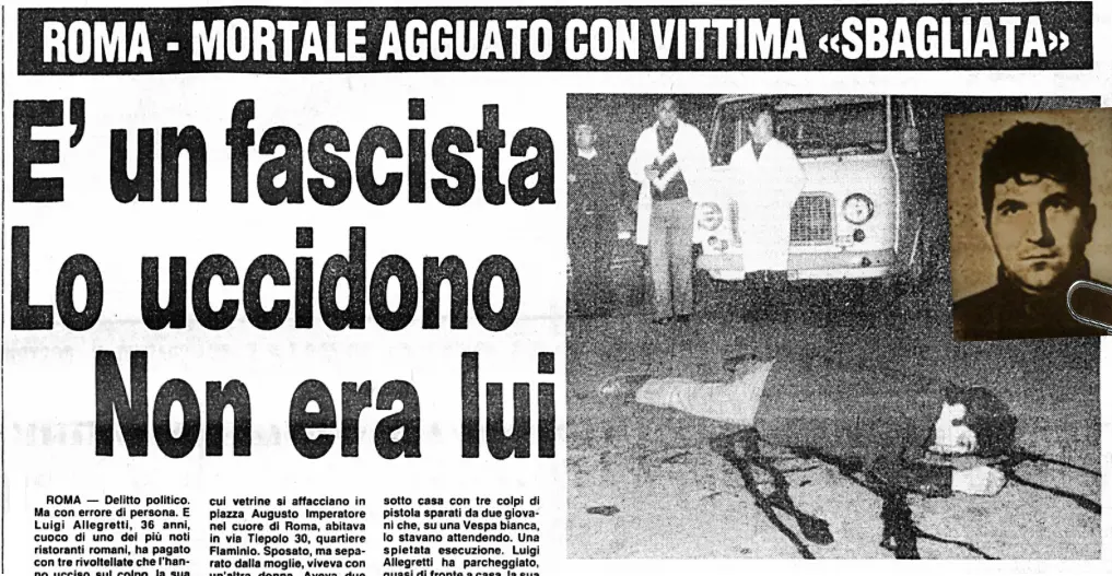 Allegretti was killed in a case of mistaken identity. The two killers’ target was Gianfranco Rosci, responsible for an MSI office in the Flaminio district and resident at number 38, not far from the scene of the crime.