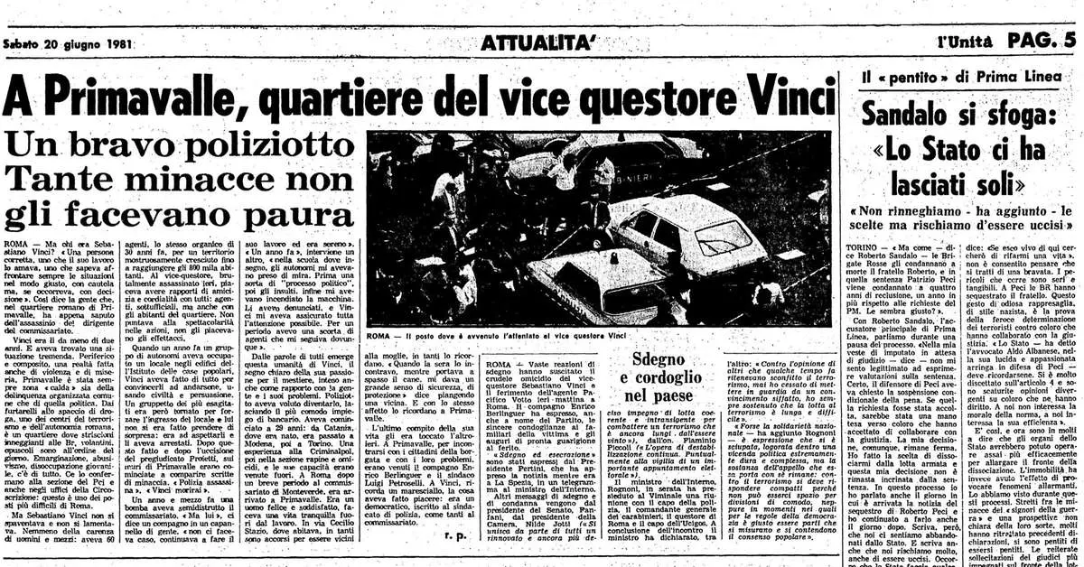 Sebastiano Vinci was a deputy police chief stationed in Rome, at the Primavalle police station. He was assassinated by a terrorist commando composed of three men and one woman, who ambushed him while he was stopped at a traffic light in his car on a street in Rome. He was hit by several bullets and died shortly after at the “Gemelli” hospital. His driver, Officer Pacifico Votto, was severely wounded and underwent multiple surgeries. The attack was claimed by the Red Brigades “March 28th Column” and subsequently also by the Revolutionary Armed Communist Nuclei. A member of the commando, Marina Petrella, was arrested in December 1982 after a shootout with the carabinieri on a Roman bus and was sentenced to life imprisonment; she later escaped to France.