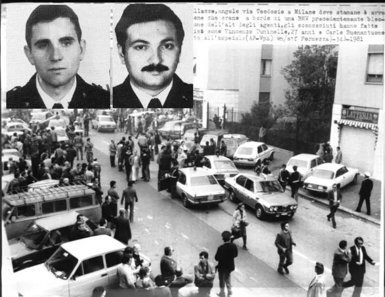At the wheel was Alibrandi, with Cavallini by his side functioning as the navigator, being the only Milanese among the three and knowing the city. Behind them was Sordi. “Alì Babà” realized they were being followed by an undercover police car and warned the other two. He was convinced that the officers were suspicious of something and that they would stop them in a few moments. It was better to act first and try everything. Suddenly he slammed on the brakes and opened the door. He jumped out and attacked the Alfasud number 51 of the Digos of Milan. He wielded two pistols and fired with both at the driver, Carlo Buonantuono, killing him with four shots. But the other two officers, Vincenzo Tumminello, seated next to Buonantuono, and Franco Epifanio, in the back seat, reacted and fired back. Cavallini and Sordi also fired at Tumminello. He was massacred with four shots from a .357 Magnum and died instantly; Epifanio, wounded, managed to get out of the car and flee, chased by Cavallini and Sordi. A passerby was also seriously injured in the shootout. But by then, Epifanio was far away, so the two terrorists turned back. Sordi approached the undercover car, took the M12 submachine gun lying on the back seat, and shot another bullet into Buonantuono’s head, who was slumped in the driver’s seat. Then they fled: with Cavallini at the wheel, Sordi beside him, and Alibrandi in the back.