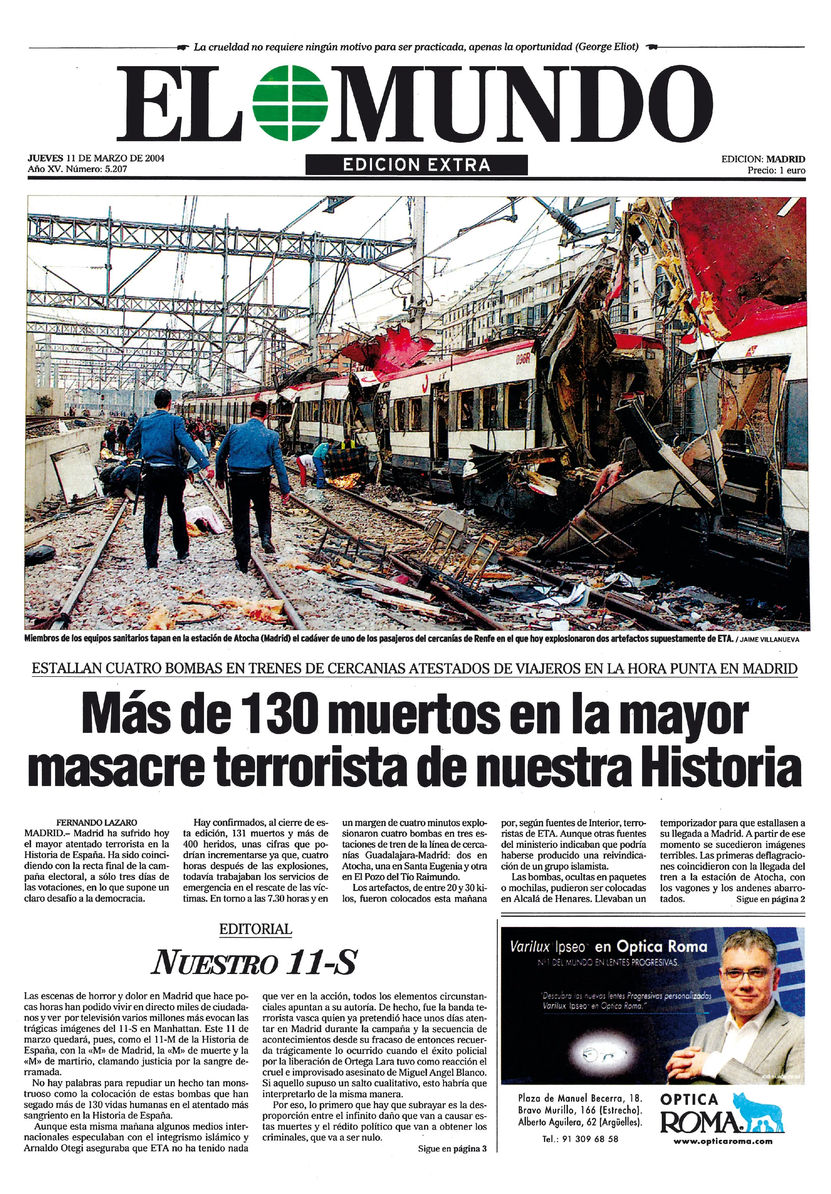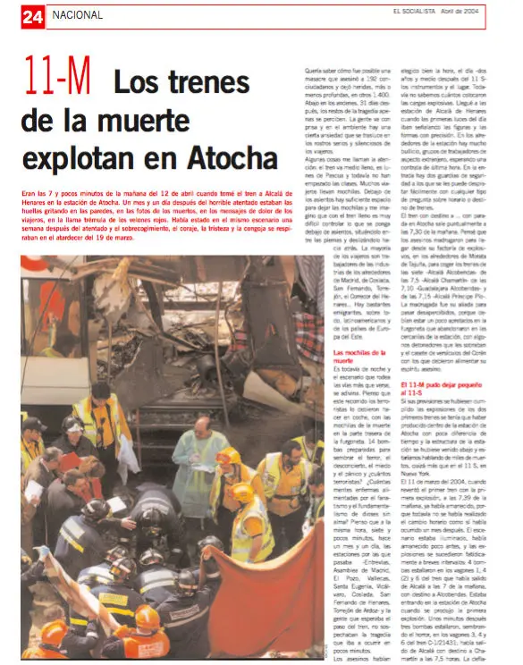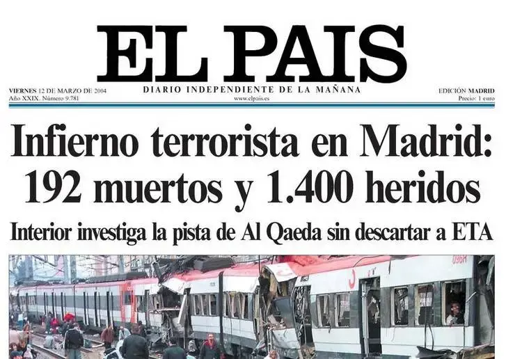 Il ricordo dell'11 settembre era ancora vivo, l'11 marzo del 2004, quando Madrid divenne teatro del più grande attentato terroristico in terra europea e che divenne il primo di una lunga serie. Alle 7:40, orario di punta, dieci delle tredici bombe piazzate dai terroristi jihadisti esplosero su quattro diversi treni delle ferrovie regionali Cercanias di Madrid, presso le stazioni di Atocha, Santa Eugenia, El Pozo e vicino via Téllez, causando un totale di 193 vittime.